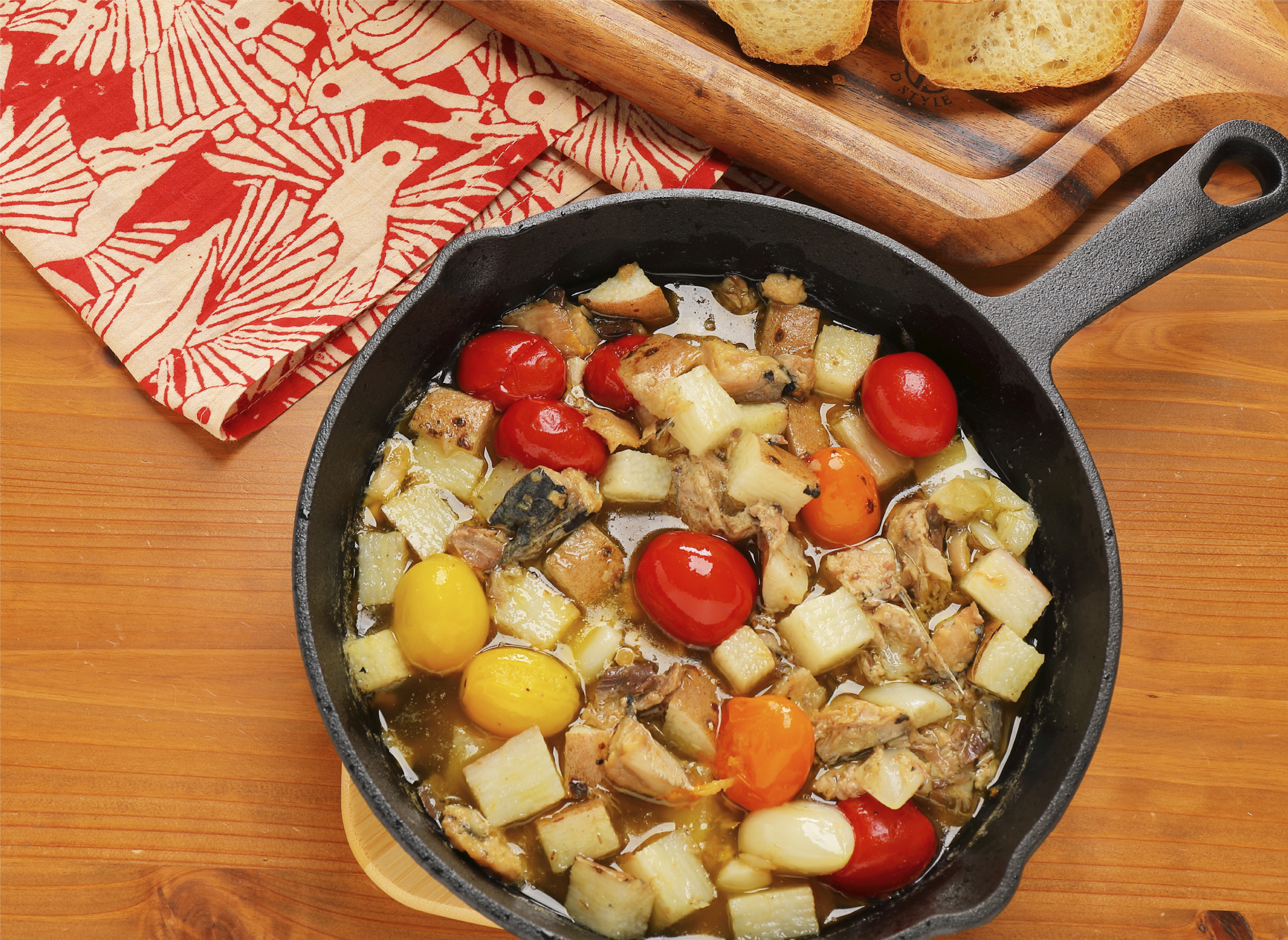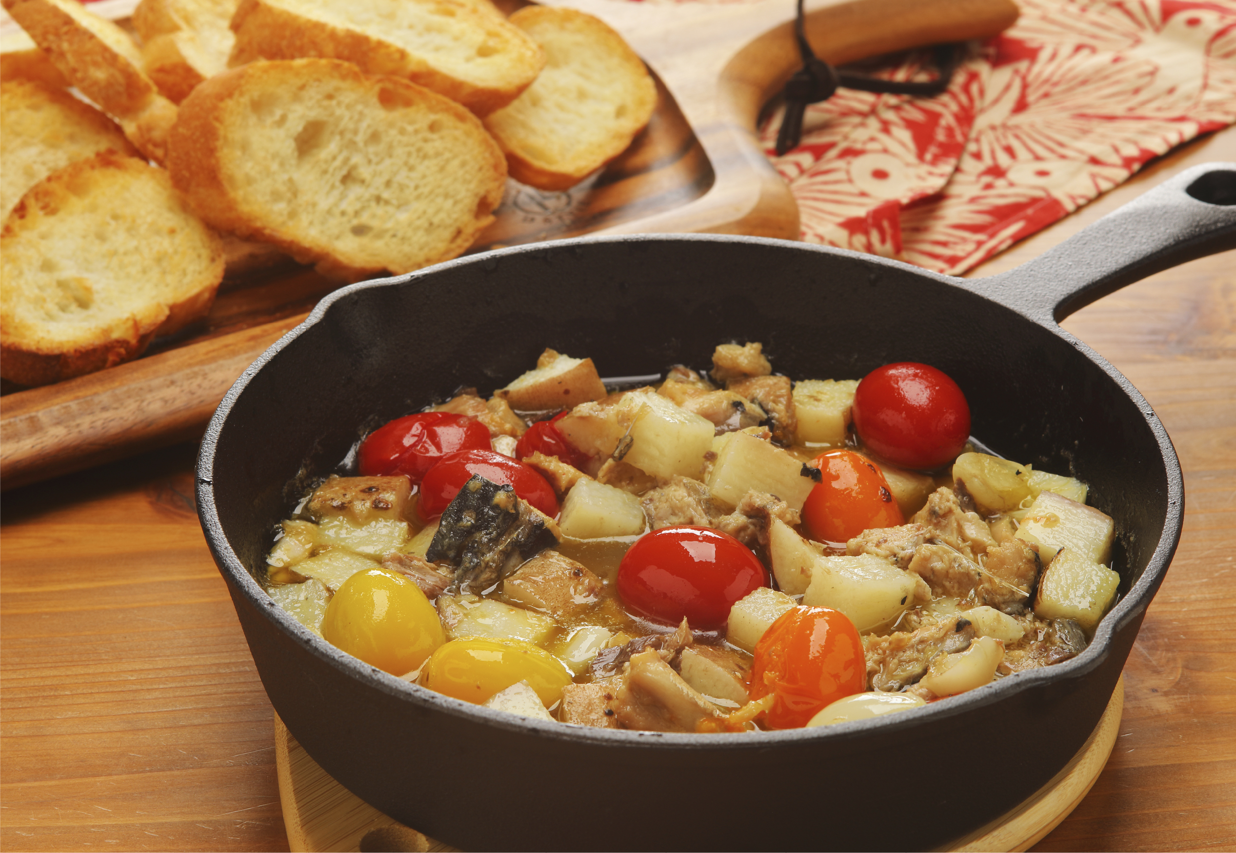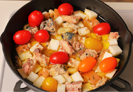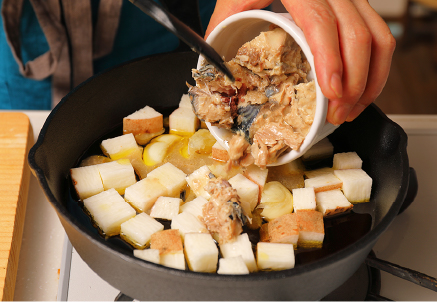 火をかける前に材料を全て入れることでオイルの味わいが深くなります。